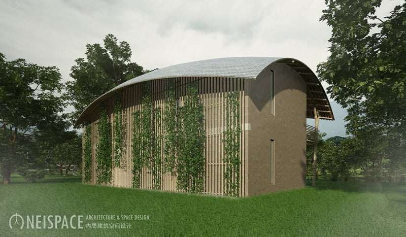 Cafe Amazon San Patong, Chiang Mai – A budget-conscious stand-alone branch built with a steel structure, featuring natural materials and a prominent bamboo slat ceiling. The design connects to both the street and a quiet rear garden.